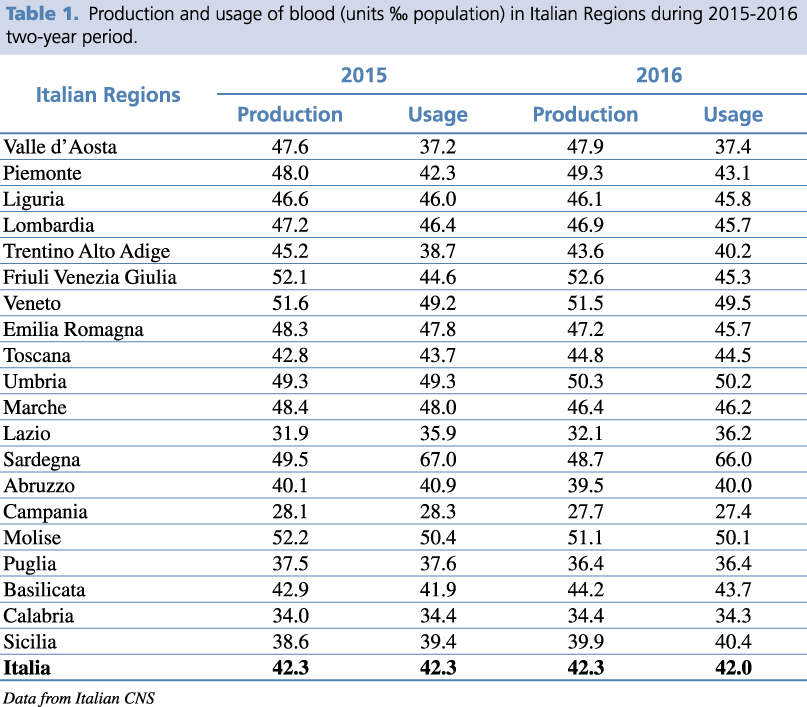 Production and usage of blood (units ‰ population) in Italian Regions during 2015-2016 two-years period.