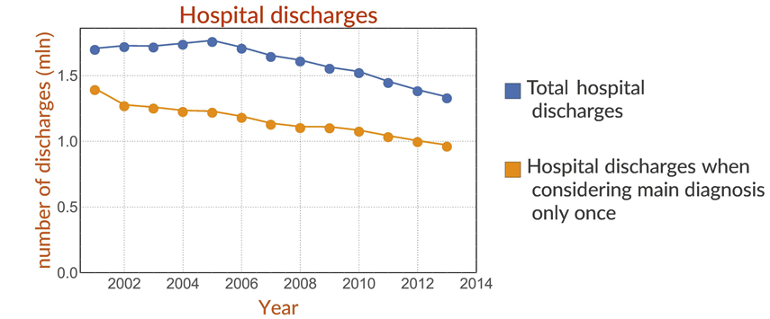 Number of hospital discharges when considering any diagnosis (upper line) or when considering the main diagnosis only once (lower line).