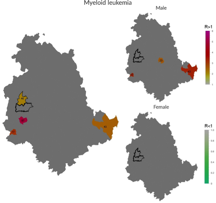 No excess in the male or female population was detected in the two towns. However, when considering the whole population (M+F) an excess of myeloid leukemia was found in Piegaro. For a correct interpretation of this finding it is needed to elucidate the plausibility of the association with environmental factors. According to the website of the American Cancer Society,8 “The only risk factors for chronic myeloid leukemia (CML) are: