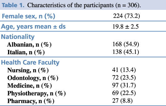 A total of 306 university students answered the questionnaire. Students from the faculty of Medicine had the largest representation in the sample, with 97 respondents in total (31.7%); Pharmacy had the fewest respondents, with 27 (8.8 %). The majority of respondents were female (71,2%), the mean age was 19.8 ± 2.5 SD. 54.7 % of respondents were Albanians (Table 1).