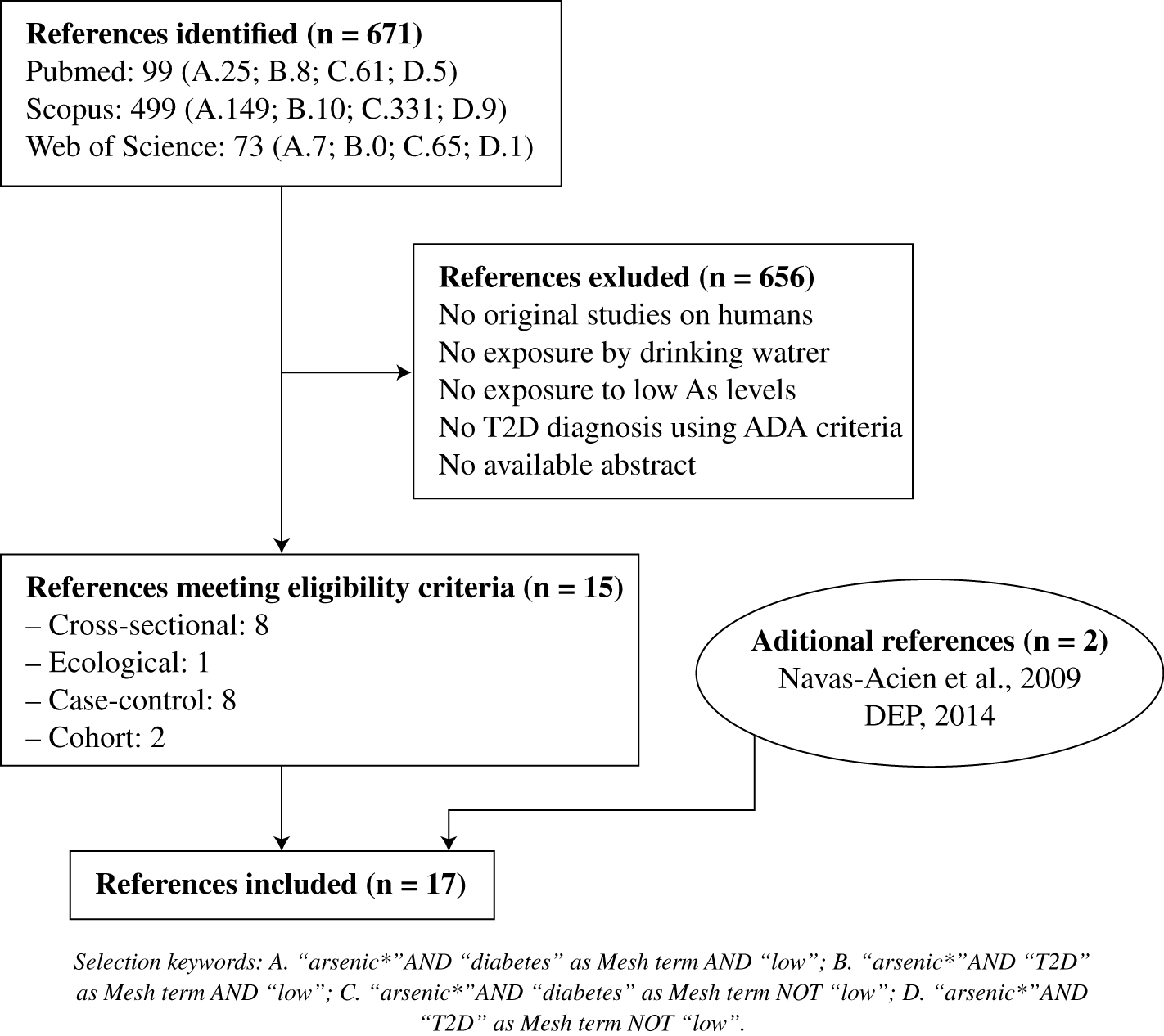 Only original researches (no reviews, editorials, or research letters) concerning humans, published from 1st of January 2005 to present, and investigating the existence of association between low arsenic exposure and the developing of Type 2 Diabetes (T2D), were included.