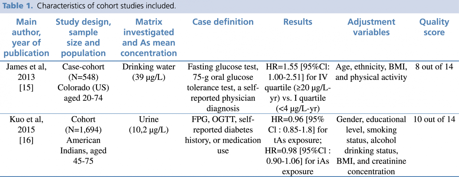 Among the seventeen included reviews, only another cohort study met our eligible criteria, the one achieved by James et al. on a sample of 548 adults living in Colorado, US. They had a mean exposure to 39 μg/L of inorganic arsenic in drinking water is statistically associated to T2D, with a risk of developing the disease of 55% higher than standard, defined as exposure to iAs in drinking water <4μg/L­yr {HR=1.55 [95%CI: 1.00­2.51]}.