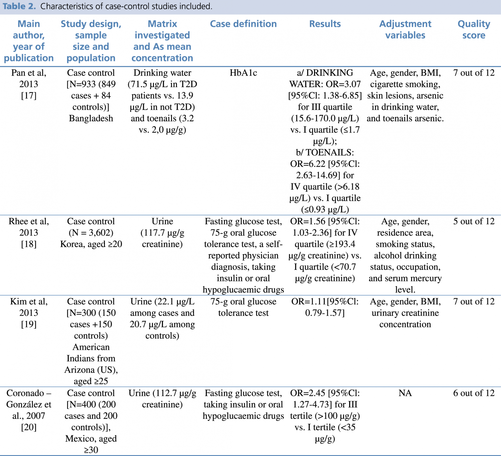 The same trend of Rhee’s work is followed by one further study, achieved by Pan et al in 2013. Pan and his group examined a sample of 933 men and women – 849 cases and 84 controls – selected from general population in Bangladesh. Investigating total arsenic levels as biomarkers of exposure, assessed that also exposure to arsenic mean concentrations <100 μg/L in drinking water and toenails increase odds of diabetes: OR= 3.07 [95%CI: 1.38­6.85] for water exposure and OR= 6.22 [95%CI: 2.63­14.69] for toenails.