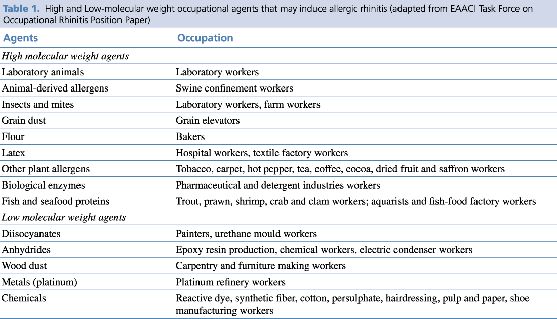 Table 1. High and Low-molecular weight occupational agents that may induce allergic rhinitis (adapted from EAACI Task Force on Occupational Rhinitis Position Paper)8