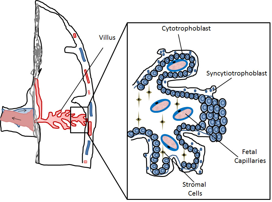 Figure 1. Schematic representation of part of the human placenta and magnification of a placental villus depicting its cellular organization.