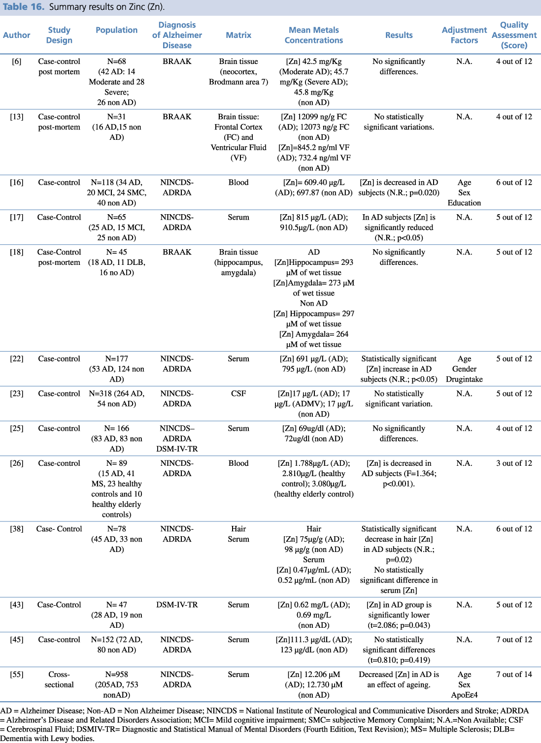 As shown in Table 16, an overall number of 13 studies assessing zinc concentration in different biological matrices (blood, cerebrospinal fluid, hair, and brain tissue) were eligible. Many of the studies (N=9) evaluated metals levels in serum samples, with not univocal results: 5 studies out of 916,17,26,44,53 showed a significant decrease in zinc blood levels in patients with Alzheimer’s disease; no statistically significant variation in metal concentration emerged from a comparable number of articles.25,38,45 Only the research carried out by Alimonti et al. on 177 subjects resulted in increased levels of zinc among AD subjects when compared with healthy controls. Three further studies were post mortem case controls, undertaken on brain tissue samples, and all showed no significant variations in zinc concentrations between cases and healthy controls. One study19 was carried out on 318 subjects (264 AD and 54 healthy controls) and showed almost identical levels of CSF zinc in cases and controls.