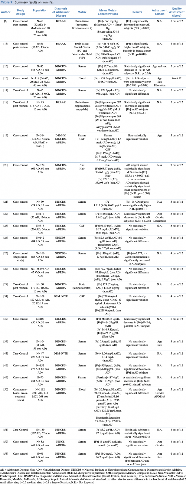 As reported in Table 7, an overall number of 25 articles on iron were considered eligible. Most of the included studies (18 out of 25) were carried out on blood as a biological matrix. One study,50 published in 2014 by Faux et al., was carried out on a large population (N=1,112: 211 with diagnosis of Alzheimer’s disease, 133 with mild cognitive impairment, and 768 healthy controls). In this study there was no evidence of any significant difference in blood iron concentration between AD and non-AD subjects. Non univocal results were reported in the remaining studies. Indeed, ten studies17,19,24,27,37,43,45,50,52,53 didn’t show substantial differences between cases and controls. Six studies15,16,22,25,32,51 showed a significant decrease in blood iron levels of AD patients when compared with healthy controls. Conversely, only one study21 showed a significant increase of iron in AD subjects compared with control group (p=0.001).