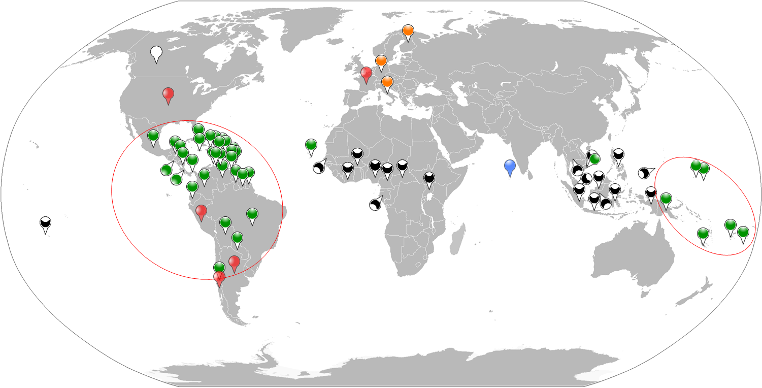 Figure 1. Geographical global vision of countries involved in ZIKV active transmission or imported cases. Period 1954-2013. Red map pin indicates the first identification of ZIKV in non-human primate, Uganda 1947. Purple map pin indicates the first human case of ZIKV in Nigeria in 1954. Green map pins indicate the human cases in the period 1954-2013 except the first one. The orange map pin indicates the imported case in Canada, 2013. Black circles virtually collect the human cases in an African and an Asian zone.
